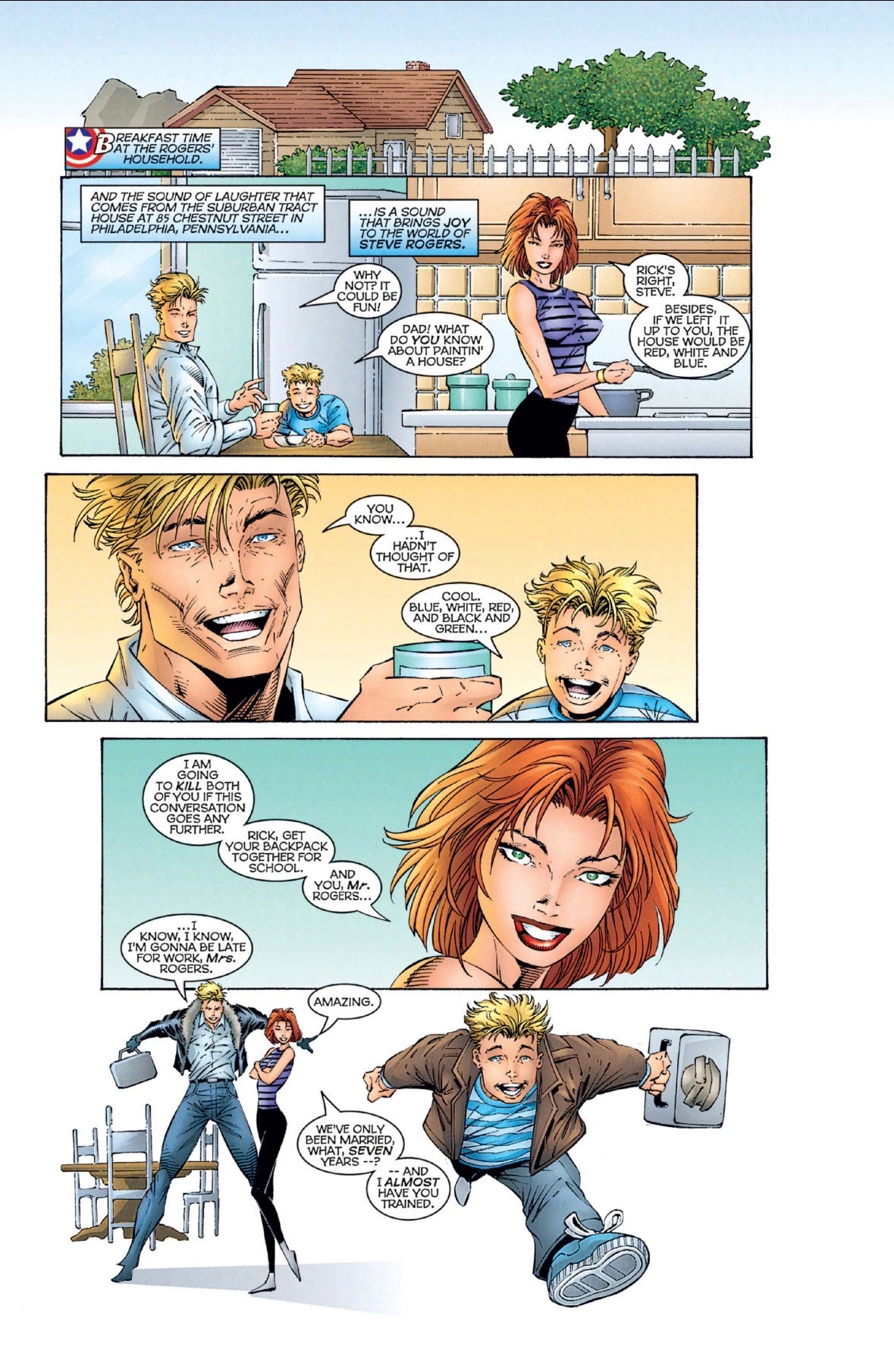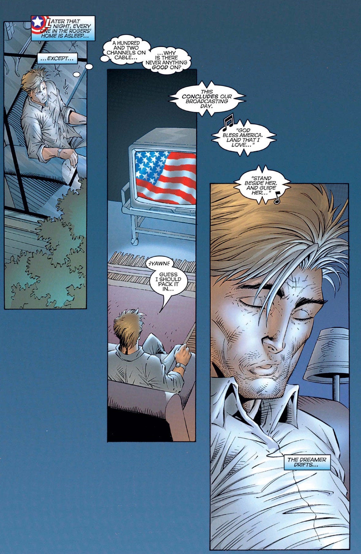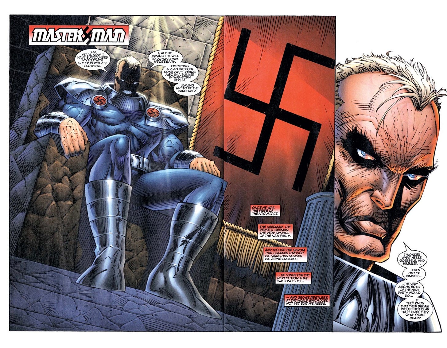 There are basically three intersecting stories here. The first is about Steve Rogers living in present day (or 1996 to be more accurate) with his wife and son in Philadelphia, but he keeps having dreams about fighting in World War II as Captain America. This version of Cap hasn’t been frozen in a block of ice since the end of the war. Instead he has had his memories wiped, and an enigmatic stranger is trying to reawaken those memories. He eventually does so by giving Cap his shield, and a big fight ensues with some kind of death squad. It’s not a bad way to communicate the classic “man out of time” nature of Cap, and it is paid off with a pretty cool fight sequence.