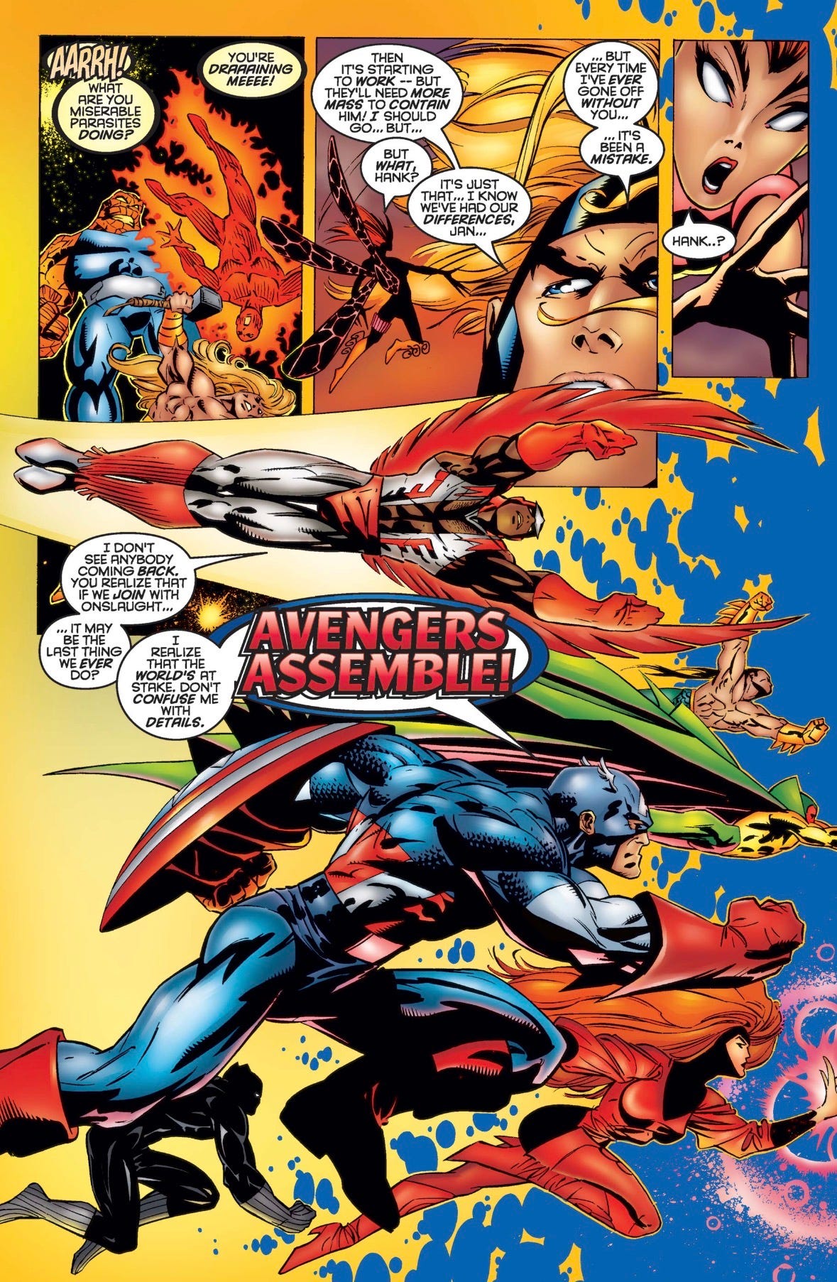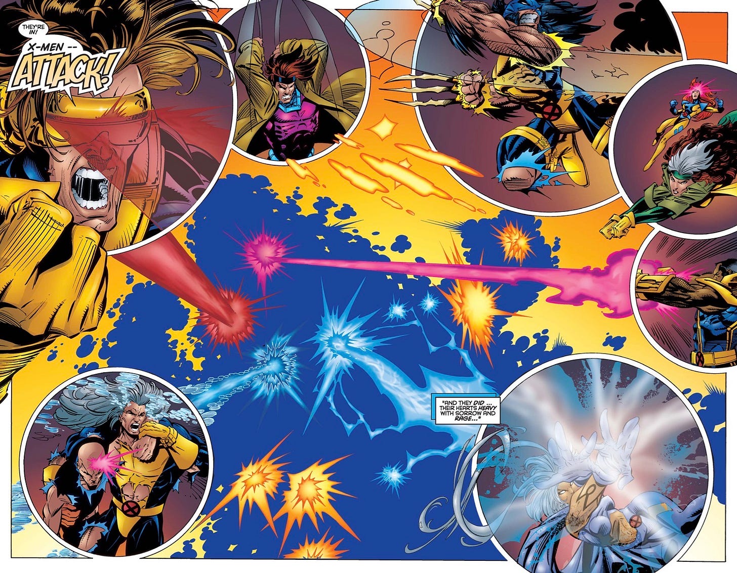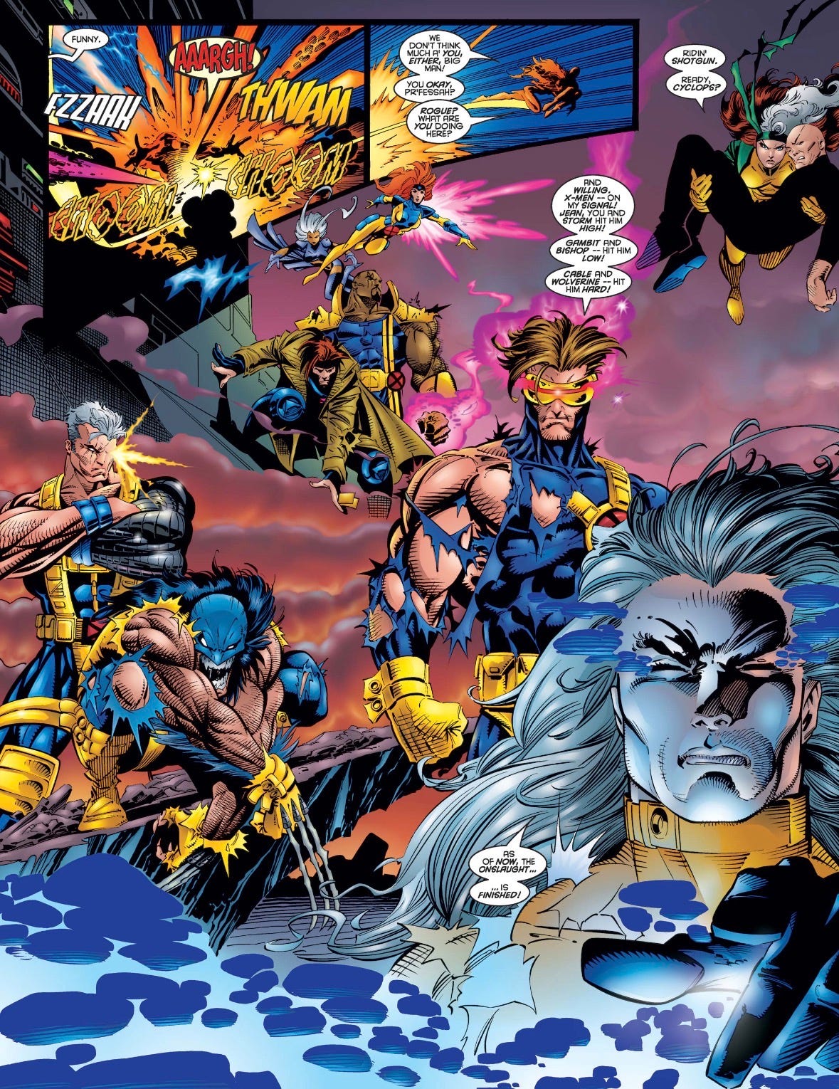 The X-Men show up first because this is primarily their event. They get Xavier away from Onslaught, and then they let the fight commence. By that I mean Onslaught immediately mops the floor with them. It literally only takes one page from him to basically defeat them. Fortunately, they get some reinforcements.