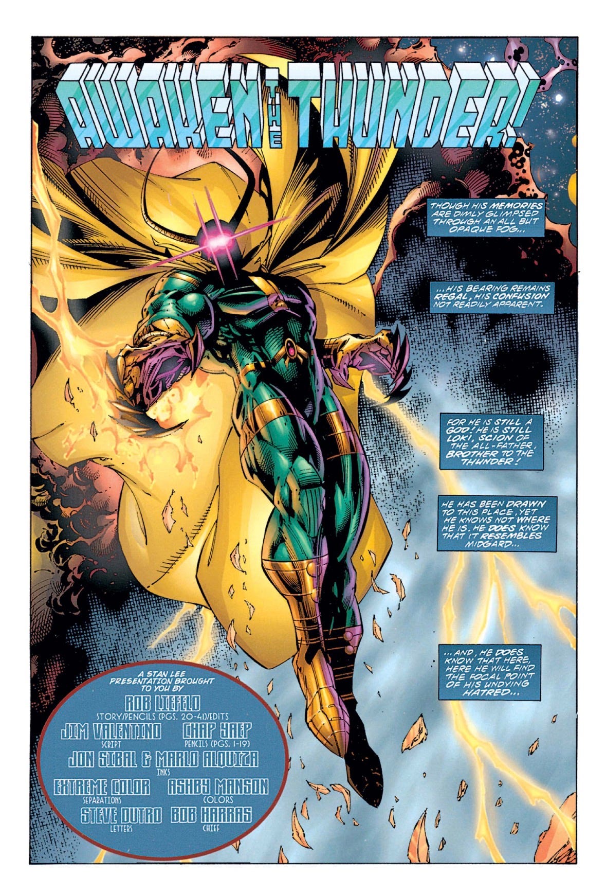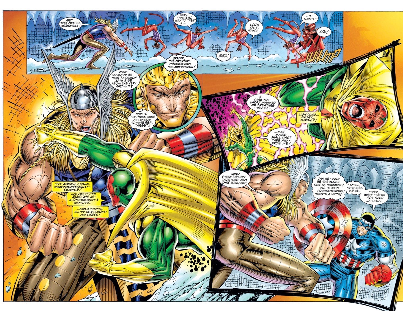 The premise of this issue is that Loki awakens in a confused state and is baffled that he can’t seem to locate Asgard or the other realms other than Midgard (Earth). We know it’s because this is all taking place within Franklin’s little pocket universe. He goes looking for Thor and finds him trapped in a block of ice. I guess Liefeld still wanted to use the guy trapped in ice gimmick that he jettisoned in Captain America, so he uses it with Thor instead. The Avengers show up to investigate as well, and Thor is freed from his icy prison. Unfortunately, Loki tricks Thor into thinking the Avengers are the bad guys. As you probably guessed, a big fight ensues.