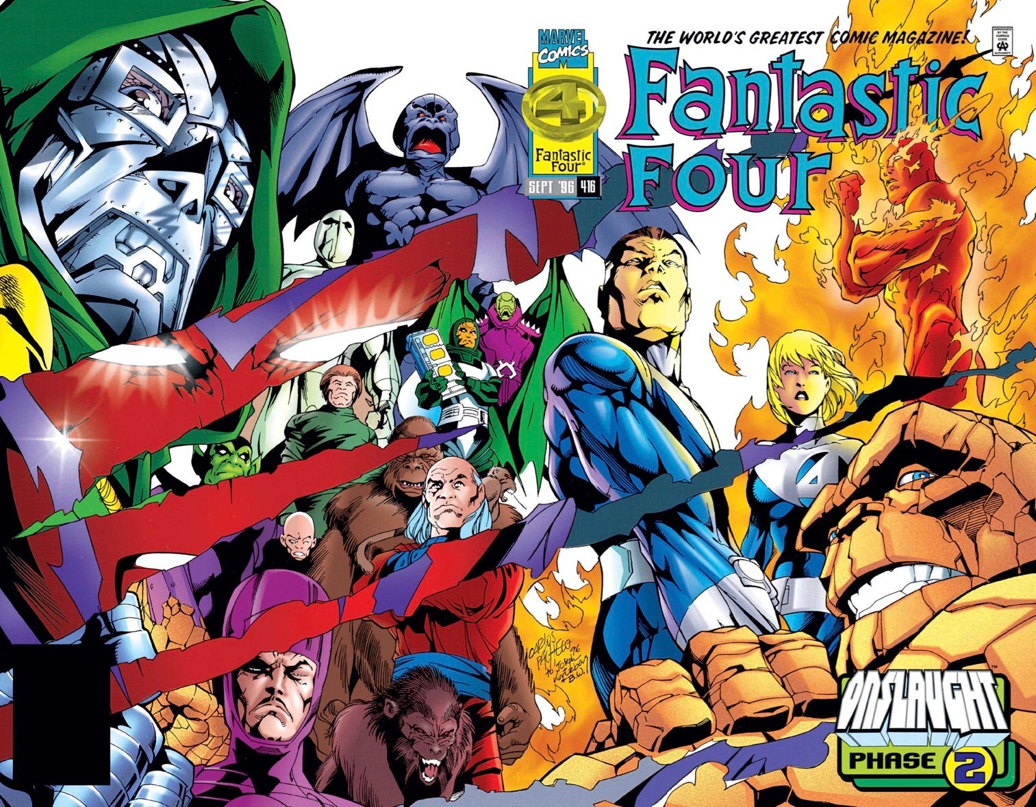 Let’s start with the final issue of Fantastic Four before its relaunch. That would be Fantastic Four #416 by Tom DeFalco and Carlos Pacheco. Fantastic Four is the comic that birthed the Marvel Universe as we know it, so it’s only right that it be the first comic we read as part of this final chapter of the Onslaught event. This issue features multiple allies (and a couple adversaries) of Marvel’s First Family coming to join them as they prepare to rescue Franklin. That includes the Inhumans, Black Panther, She-Hulk, Namor, and even Doctor Doom. Unfortunately, they end up coming under attack from basically every villain they’ve ever had. Mole Man, Wizard, Kang, Red Ghost, Psycho-Man, Annihilus, and many more all descend upon our heroes seemingly out of nowhere. As you might have guessed, these are all just constructs created by Onslaught to harass our heroes. Reed Richards creates a device to cause them to dissipate, and the Fantastic Fifty (at least it seems like that many heroes) get ready for their final battle with Onslaught.
