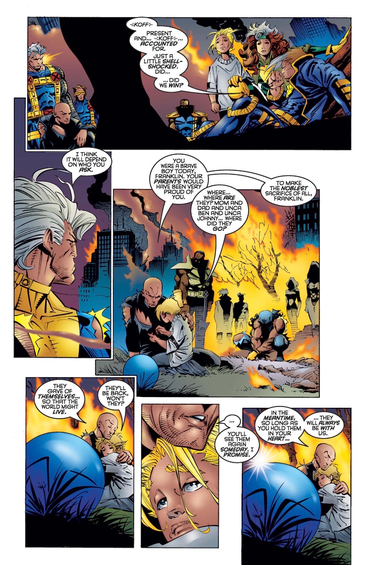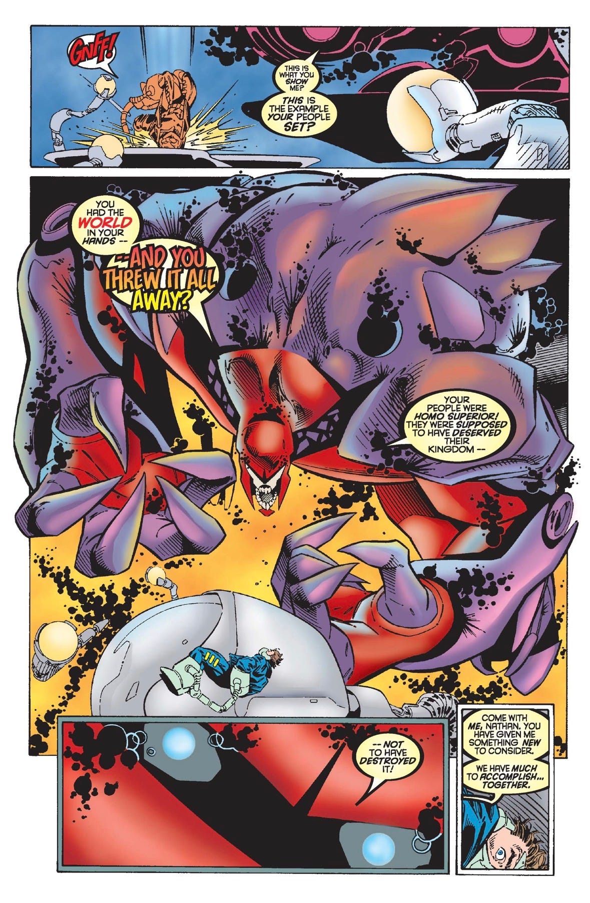 He drills deep into X-Man’s mind in order to understand what the “Age of Apocalypse” universe was like, and he is bitterly disappointed with what he finds. Onslaught had planned to recreate that universe here under the assumption that a world where mutants were in charge would be superior to one where humans are. Seeing all of the violence and death that took place with Apocalypse in charge convinces him that the best move would be wiping out both species entirely. With Franklin and X-Man both under his control, he might just have the power to do so. The issue ends with Xavier meeting with Onslaught by himself to try and talk some sense into him. Unsurprisingly, this fails miserably. This finally sets up the grand finale.