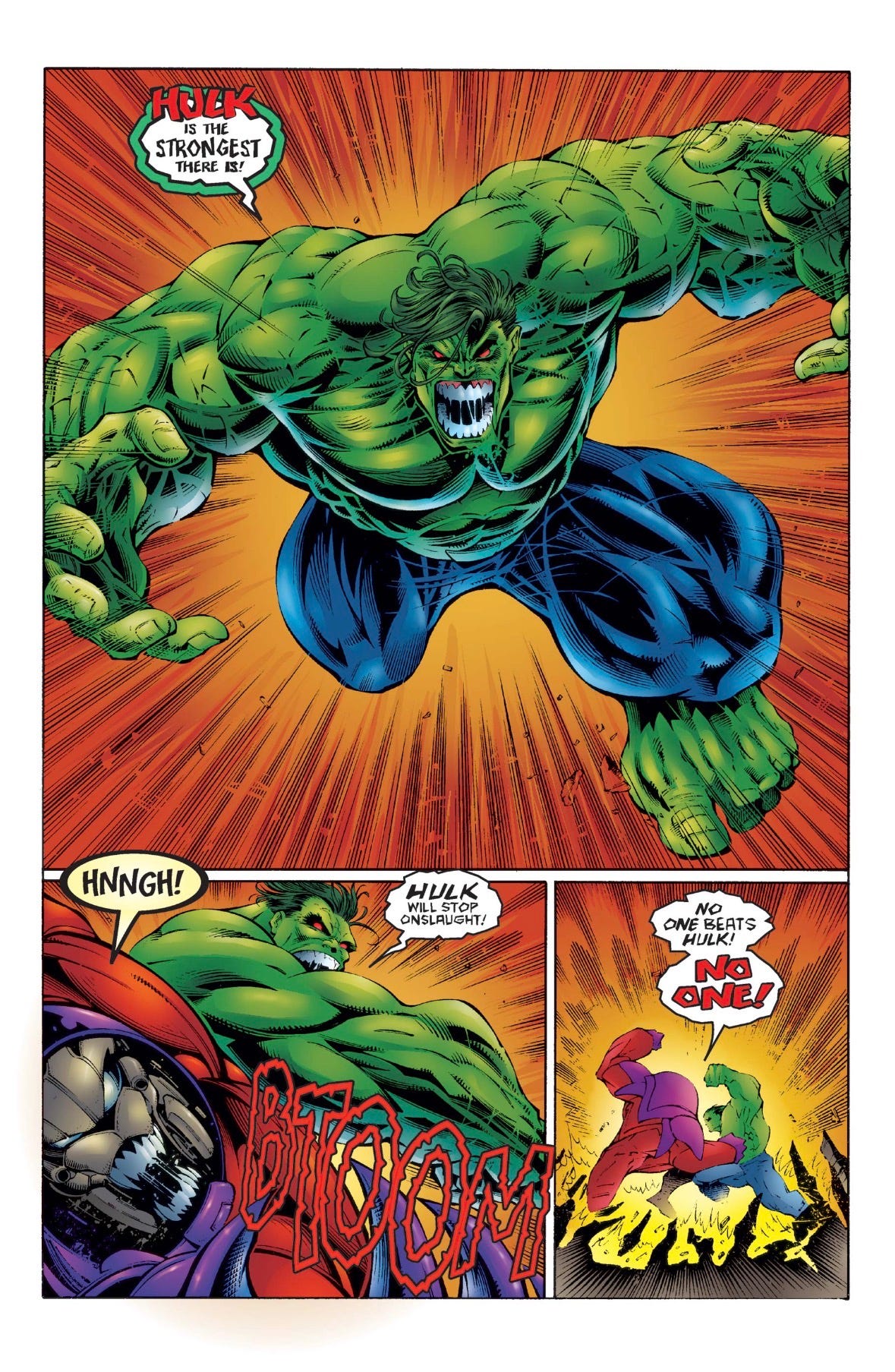 It results in one of the most metal comic book fights I’ve ever seen. Hulk and Onslaught start punching each other so hard that it creates shockwaves so intense that the other heroes (as well as plenty of debris) are being blown back like they’re in a hurricane. Hulk ends up punching Onslaught so hard that it shatters his armored exoskeleton, but it also causes Hulk and Banner to split into two separate physical individuals. The explanation (provided by Gambit of all people) is that Hulk punched him so hard that it altered reality. It’s very silly, but I love it. I also want to point out that this whole Onslaught saga started with him punching Juggernaut from Canada to New Jersey, so I think we can definitively say that Hulk is the strongest one there is.
