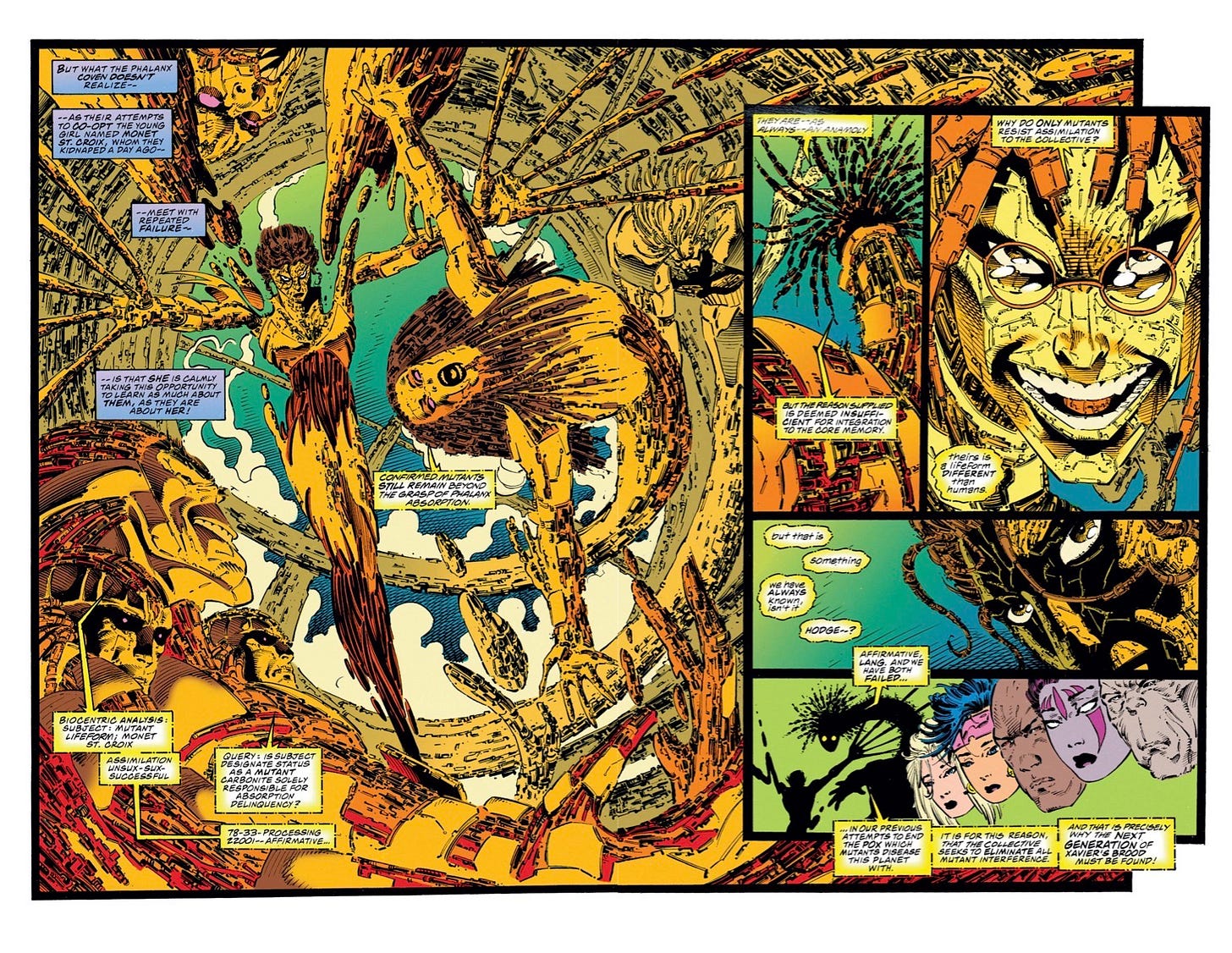 The last example I’d like to mention is the Phalanx from Marvel Comics. Created by Scott Lobdell and Joe Madureira, they are a race of techno-organic extraterrestrials that infect and absorb other life forms. Humans who are infected seem to retain some of their personality traits, but their motivations become entirely to serve the greater hive mind. They’re probably best remembered for being the primary antagonists in the “Phalanx Covenant” crossover event in 1994, but they also played an important role in the Powers of X comic book series from Jonathan Hickman and R.B. Silva in 2019.